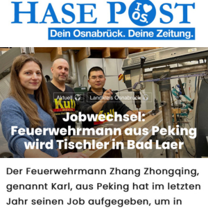 Herr Zhang absolviert derzeit seine Tischlerausbildung in Bad Laer. Wir haben ihn einen Tag lang bei seiner Arbeit begleitet. Erfahrt hier mehr über seine Eindrücke sowie darüber, was sein Vorgesetzter und Kollegen über ihn zu sagen haben.